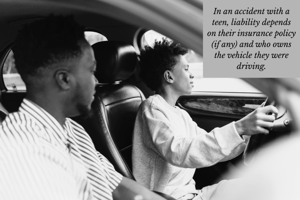 Perhaps you were rear-ended at a stoplight by a young driver or one turned in front of you in an intersection. Just because they caused the accident doesn’t mean they are responsible for damages. In an accident with a teen, liability depends on their insurance policy (if any) and who owns the vehicle they were driving.