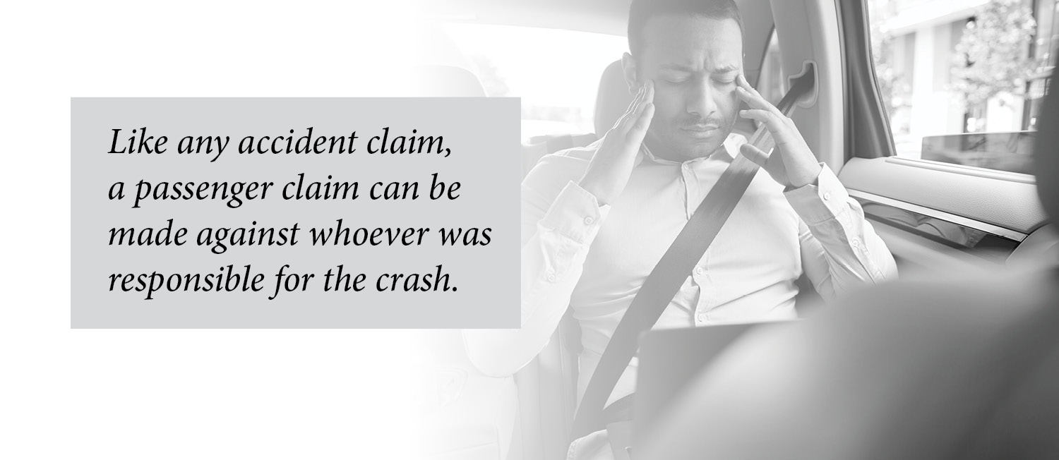 Like any accident claim, a passenger claim can be made against whoever was responsible for the crash. What makes passenger claims unique is that the claim may be made against a friend or acquaintance who was driving (if they are at fault), rather than the stranger in another car. And if the at-fault driver’s insurance is insufficient, the passenger can file a lawsuit.
