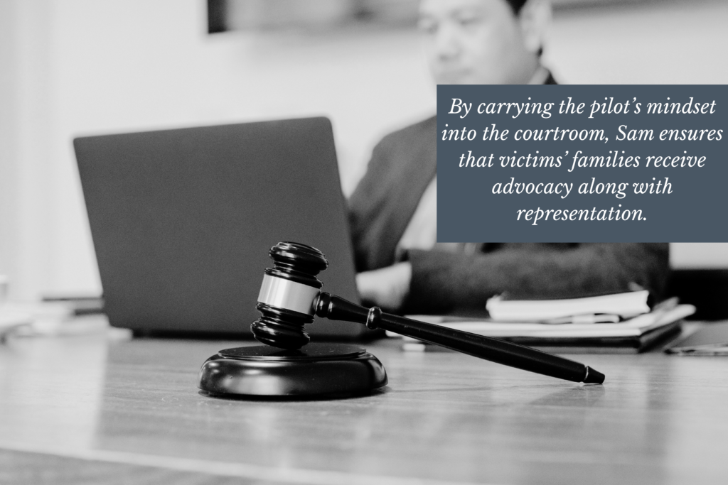 By carrying the pilot’s mindset into the courtroom, Sam ensures that victims’ families receive advocacy along with representation.