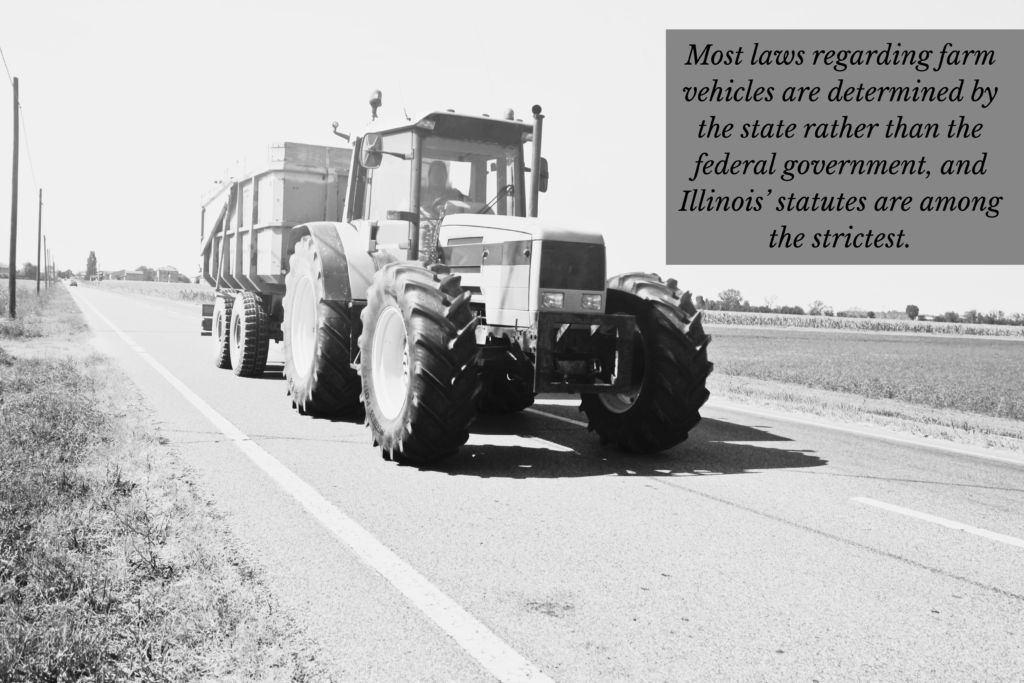 Tractors and other farm equipment have the right to be on public roadways. They are, however, subject to the same rules as ordinary vehicles, plus some additional restrictions. Most laws regarding farm vehicles are determined by the state rather than the federal government, and Illinois’ statutes are among the strictest.