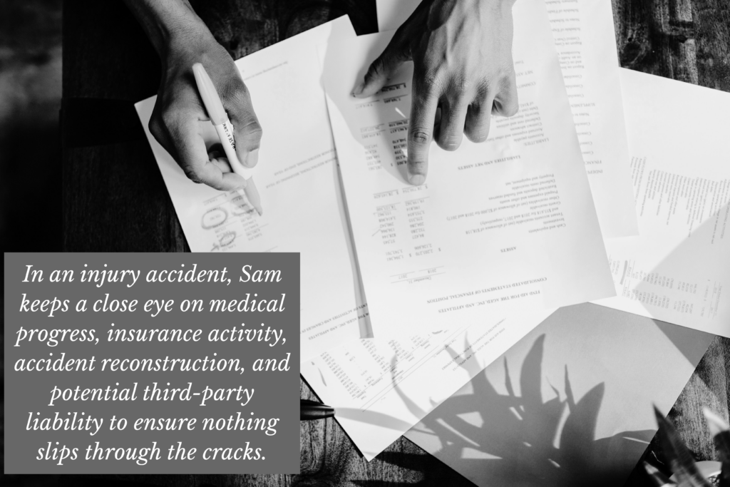 Pilots are also trained to monitor multiple factors at once – such as the weather, instruments, airspace, fuel, terrain and more – without losing focus. In an injury accident, Sam keeps a close eye on medical progress, insurance activity, accident reconstruction, and potential third party liability so nothing slips through the cracks.
